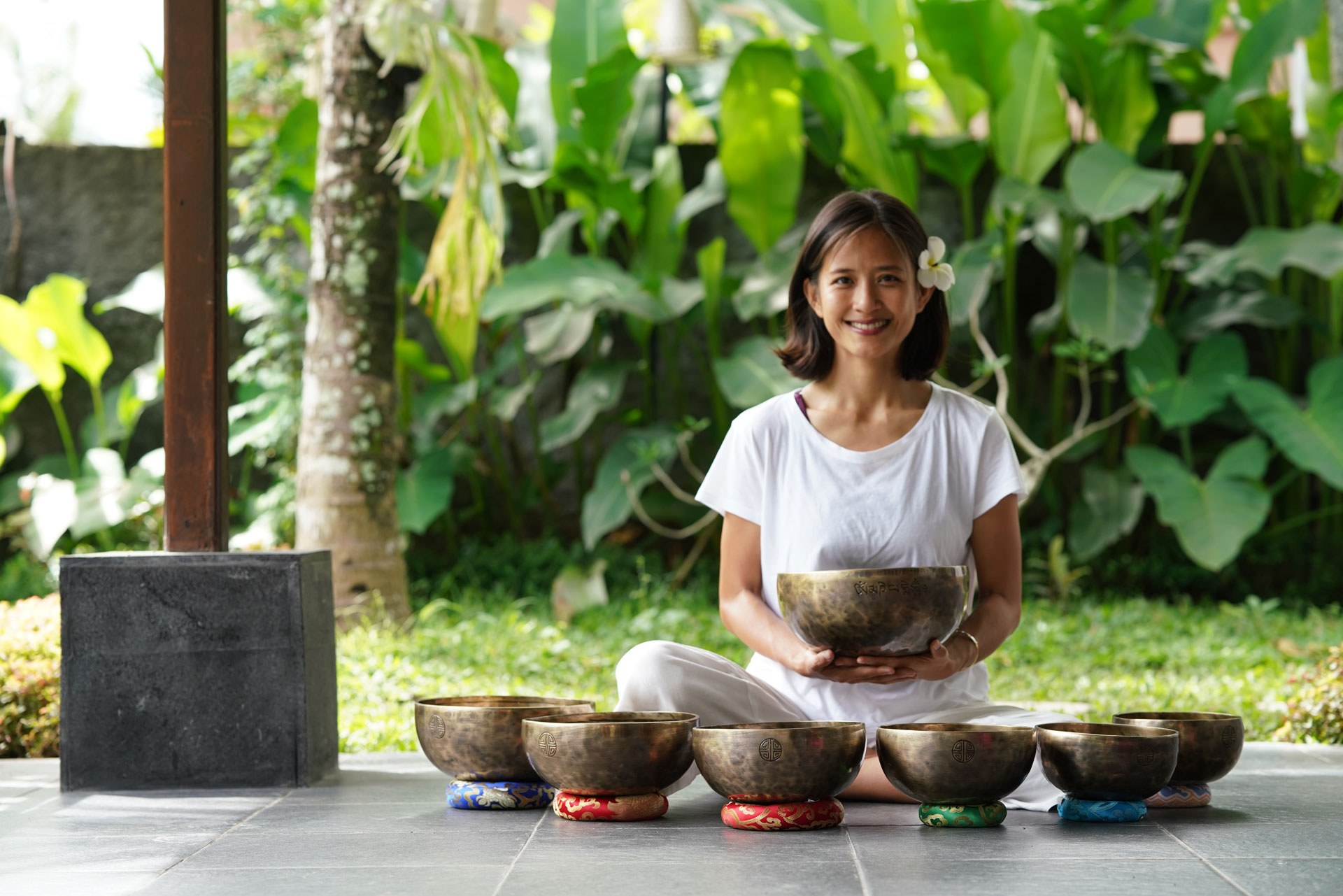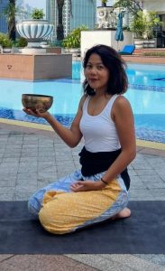 Known as a yoga teacher, rehab trainer and sound healer in Indonesia. Through yoga postures, breathing techniques and Tibetan singing bowls she trains people with postural and emotional imbalance to regain their equilibrium and flexibility.